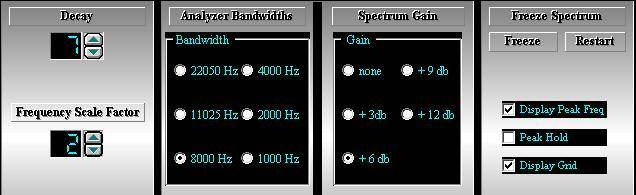 The Analyzer section gives the user control of spectrum update / decay rate, frequency bandwidth, gain, freezing a spectrum, automatically reading the peak frequency, holding the peaks, and spectrum grid.