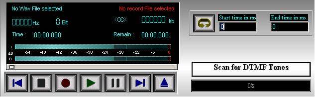 The software features a standard WAV player with built in loop function, display of file name, sample rate, bit resolution, elapsed time, remaining time, level indicator, play, record, pause, and a high speed WAV file scan for DTMF tone decoding.